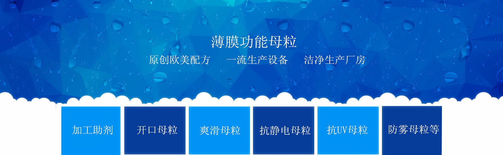 塑料薄膜功能母粒 牌号(PE/PP) 描述 特征 应用范围 HC-PLCI 流变加工母粒 3M/大金优质保障 复合薄膜加工 HC-PLCII 流变加工母粒 3M/大金优质保障 薄膜片材加工 HC-KS01 开口母粒 开口母料,透明性好 包装袋手提袋 HC-KS03 爽滑母粒 高透明性,降低摩擦系数显著 薄膜加工 HC-KS07 爽滑,开口复配型 浓缩高效,一材两用 薄膜加工 HC-KS200 抗静电爽滑母粒 永久性非迁移 防静电包装膜 HC-AS201 抗静电爽滑母粒 迁移性 防静电包装膜 HC-AF088 防雾母粒 适合水分比较高的包装,肉、鱼、蔬菜 食品包装 HC-AF011 防雾母粒 增强光照度。配合UV 母料,效果更佳 农膜防雾 HC-UV90 抗UV母粒 食品级抗UV母粒 户外薄膜 HC-KO25 抗氧化母粒 耐高温320度 户外薄膜 HC-S001 透明填充母粒 不影响透明度,降低成本 包装薄膜 HC-CH88 透明成核剂母粒 有效提高PP塑件物理性能 PP制品
